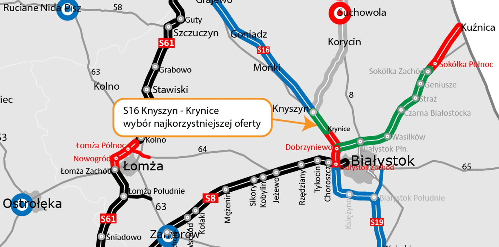 Realizacja odcinka S16 Knyszyn – Krynice jest ważnym krokiem w kierunku uzupełnienia sieci dróg ekspresowych w Polsce. Droga jest częścią trasy ekspresowej S16 łączącej Ełk z Knyszynem i wpisuje się ona w strategiczne plany rozwoju infrastruktury drogowej kraju. Projekt ten nie tylko ma poprawić dostępność komunikacyjną regionu, ale także przyczynić ma się do zwiększenia bezpieczeństwa i komfortu podróżujących.