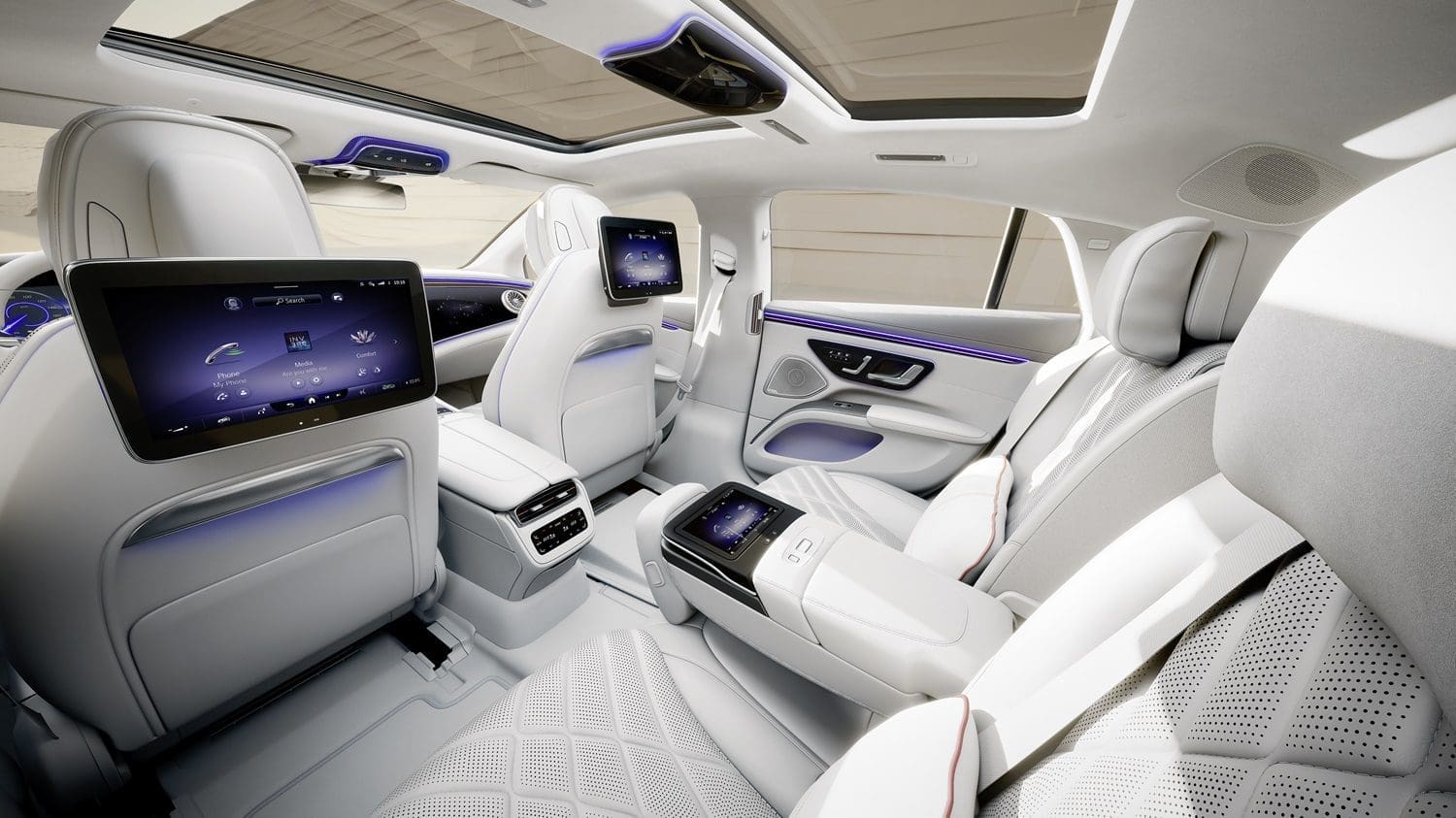 We wnętrzu Mercedesa EQS szczególną uwagę zwracają nowe dysze wentylacyjne z chromowanym obramowaniem oraz dodatkowe poduszki z tyłu, które teraz charakteryzują się lamówką ze skóry nappa. Opcjonalny pakiet Rear Comfort Plus z fotelami Executive wzbogaca standard wyposażenia, który oferuje między innymi specjalny, pochylony podnóżek oraz możliwość regulacji oparcia siedzeń do 38 stopni, zapewniając pasażerom wyjątkowy komfort podróży.