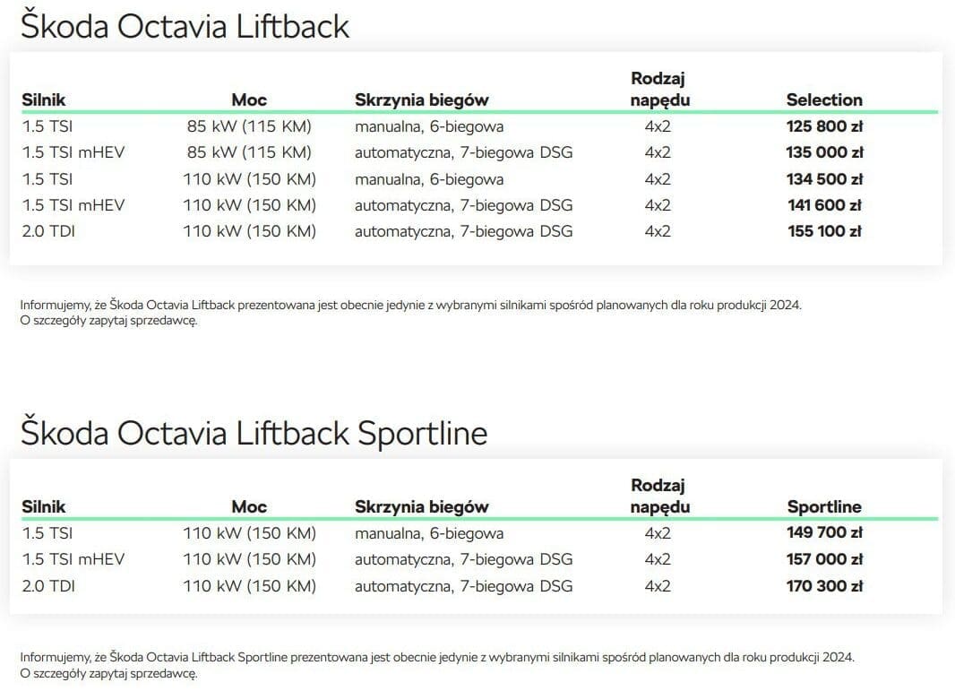 Szczegółowy cennik nowej Skody Octavia sprawdzicie tutaj. W nim znajdziecie szczegółowy opis wyposażenia, pakietów dodatkowych oraz danych technicznych samochodu.