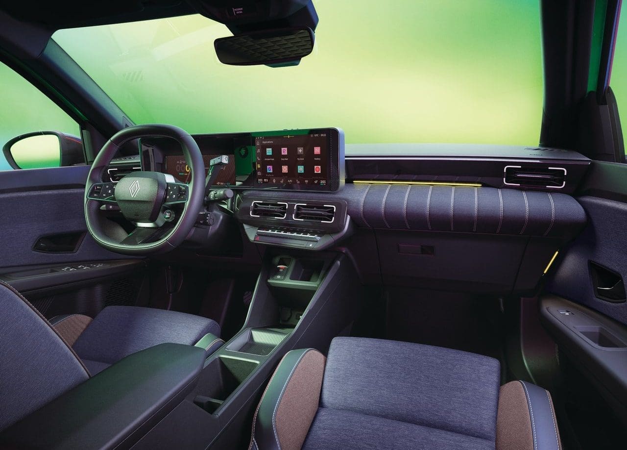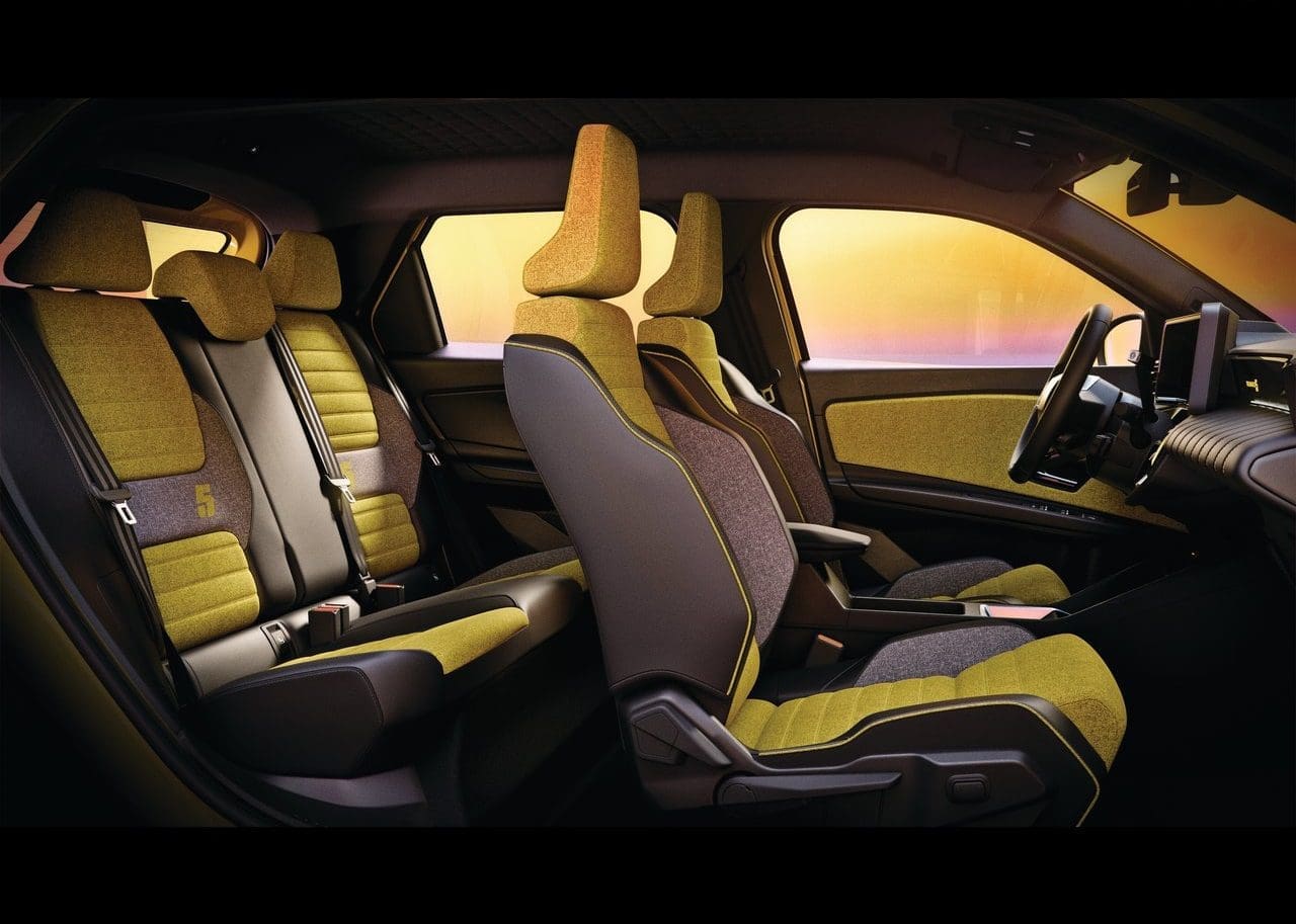 Wnętrze Renault 5 E-Tech wyróżnia się nie tylko stylowym, ale i ekologicznym designem. Tapicerka wykonana została z dżinsu pochodzącego w 100% z recyklingu butelek PET i zdobi siedzenia, deskę rozdzielczą i panele drzwi w wersji Techno. Z kolei topowa wersja Iconic Five oferuje szare obicia z żółtym motywem w kształcie litery „H” oraz nadrukiem „5”.